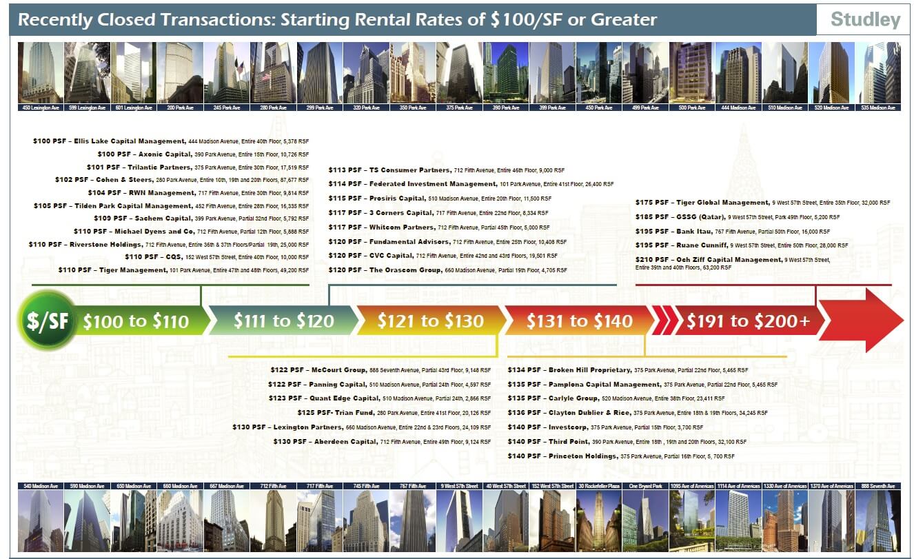 2013 was a very active year for office space leasing in New York City. For the first time since the economic collapse, demand for high-end Class A office product finally began to percolate. While there were only a handful of commercial real estate deals with triple digit rents between 2009 and 2012, 2013 had dozens. Buildings such as 510 Madison Avenue, 660 Madison Avenue, 375 Park Avenue (The Seagram Building), 767 Fifth Avenue (GM Building), 712 Fifth Avenue and 9 West 57th Street have each attracted multiple deals with tenants willing to pay up.
