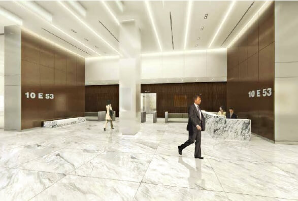 With brand new office product lacking in The Plaza District, it is not atypical for New York City landlords to renovate their existing assets in an effort to attract big name tenants. Several notable “spruce ups” over the past couple of years (for example lobby renovations and upgrades, etc.), include 1290 Avenue of the Americas (Vornado), 575 Lexington Avenue (Normandy), 1370 Avenue of the Americas (Principal Global), 150 East 52nd Street (Princeton International) and the current work being done to upgrade 560 Lexington Avenue (Rudin). Though lobby renovations, elevator cab improvements and cosmetic work are common for such overhauls, it is very unusual for owners to upgrade their towers to the extent that SL Green is refurbishing 10 East 53rd Street, formerly known as The Harper Collins Building.
